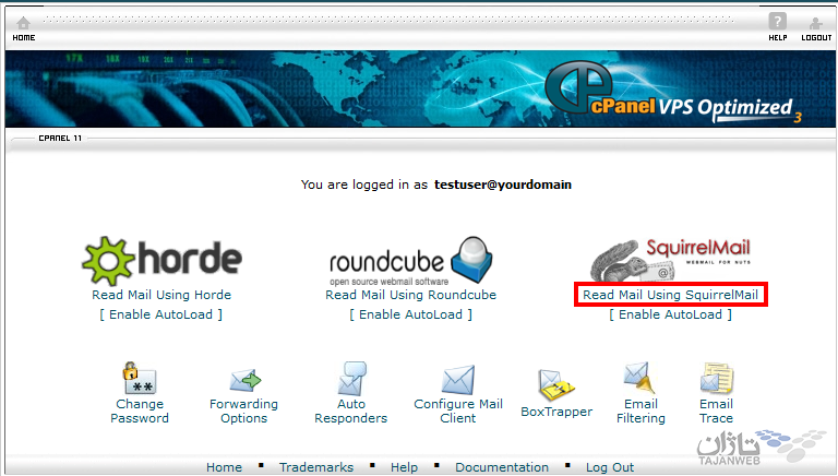 2- از آنجا که شرکت تاژان سه وب میل متفاوت (Horde, Round Cube, Squirrel Mail) برای سرویس های لینوکس خود برروی کنترل پنل CPanel در نظر گرفته است لذا در این صفحه امکان انتخاب هریک از این وب میل ها برای کاربران وجود خواهد داشت. در صورتیکه قصد استفاده از هریک از این سه وب میل را دارید کافیست در این مرحله برروی گزینه ی "Read Mail Using …." مرتبط با وب میل موردنظر کلیک نمایید. (در این دستورالعمل وب میل SquirrelMail مد نظر می باشد)