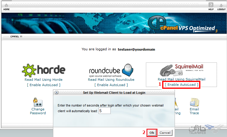 اگر قصد دارید همیشه از یک وب میل خاص استفاده نمایید کافیست گزینه [ Enable AutoLoad ] مرتبط با وب میل مورد نظر خود را انتخاب و سپس برروی دکمه ok کلیک نمایید. بعداز انجام این تنظیم می باید گزینه ی "Read Mail Using …." مرتبط با وب میل مورد نظر را نیز (تنها برای یکبار) جهت ورود انتخاب نمایید. (در این دستورالعمل وب میل SquirrelMail مد نظر می باشد)