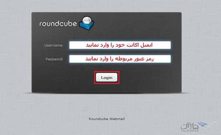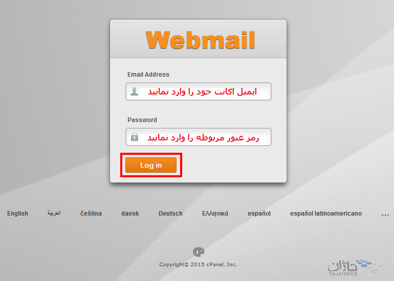 در صورتیکه کنترل پنل هاست شما Cpanel است، ابتدا آدرس webmail.yourdomain را (به جای yourdomain از نام دامین خود استفاده نمایید) در مرورگر وارد نموده و در صفحه ی لود شده ایمیل اکانت و رمز عبور مورد نظر را وارد و سپس بروری دکمه ی login کلیک نمایید.