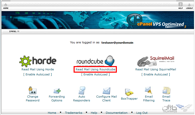 2- از آنجا که شرکت تاژان سه وب میل متفاوت (Horde, Round Cube, Squirrel Mail) برای سرویس های لینوکس خود برروی کنترل پنل CPanel در نظر گرفته است لذا در این صفحه امکان انتخاب هریک از این وب میل ها برای کاربران وجود خواهد داشت. در صورتیکه قصد استفاده از هریک از این سه وب میل را دارید کافیست در این مرحله برروی گزینه ی "Read Mail Using …." مرتبط با وب میل موردنظر کلیک نمایید. (در این دستورالعمل وب میل RoundCube مد نظر می باشد)